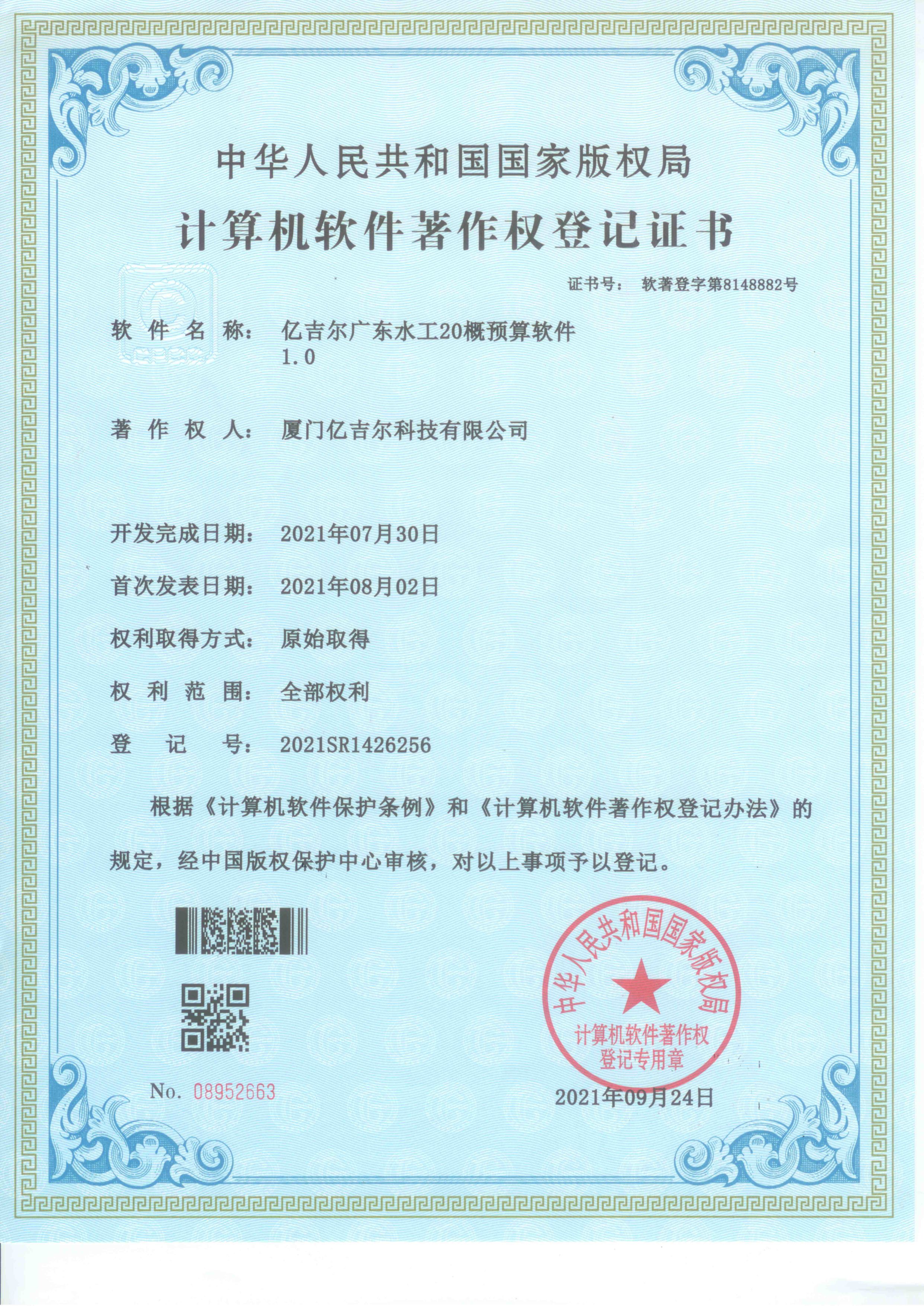 億吉爾廣東水工20概預(yù)算軟件著作權(quán)登記證書 發(fā)布日期:2023年11月22日 瀏覽次數(shù):2747 關(guān)鍵字: 公司 1/1億吉爾廣東水工20概預(yù)算軟件著作權(quán)登記證書_1