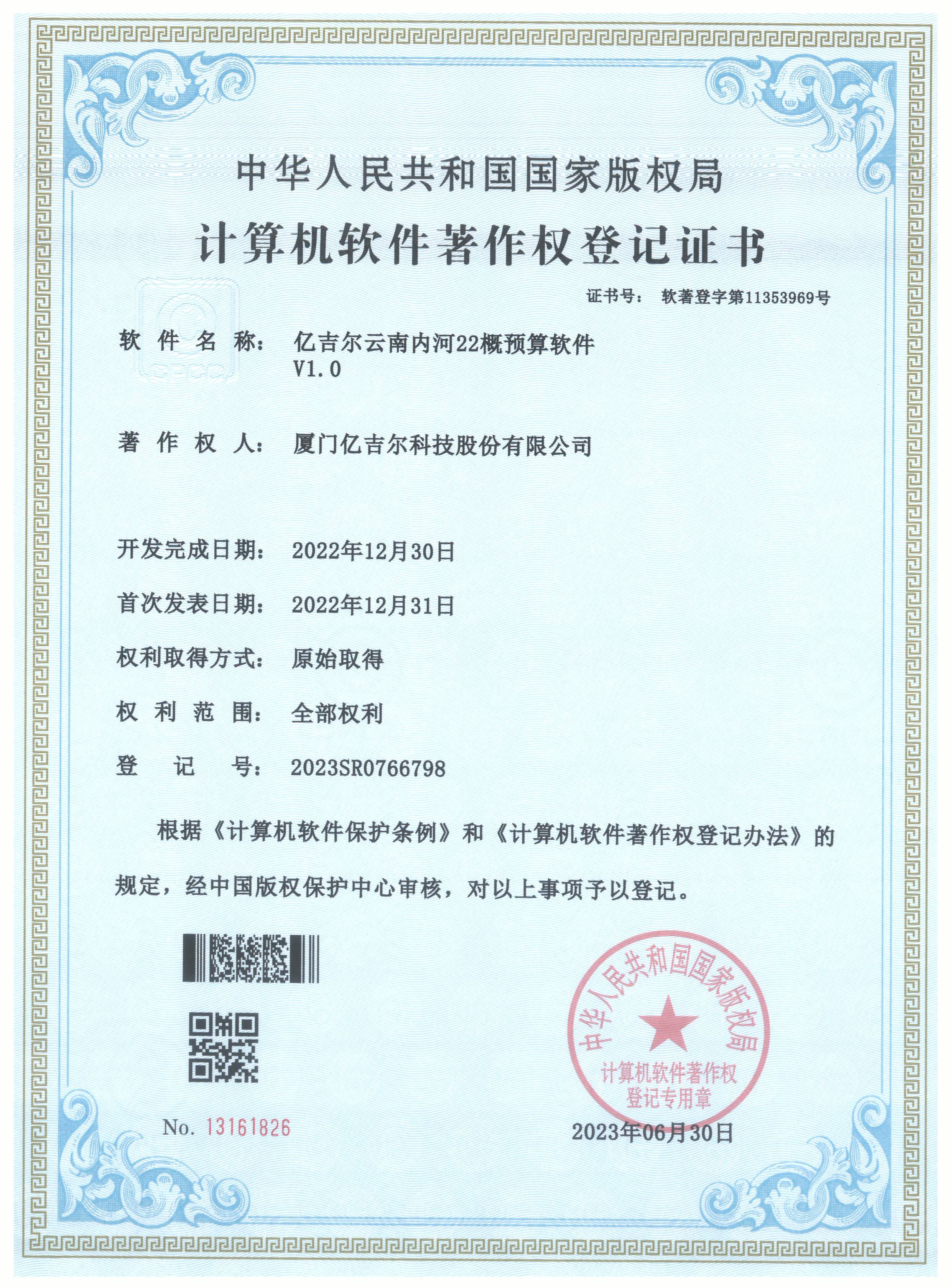 億吉爾云南內(nèi)河22概預算軟件登記證書 發(fā)布日期:2023年11月22日 瀏覽次數(shù):2577 關鍵字: 公司 1/1億吉爾云南內(nèi)河22概預算軟件登記證書(2023R11L0546651)
