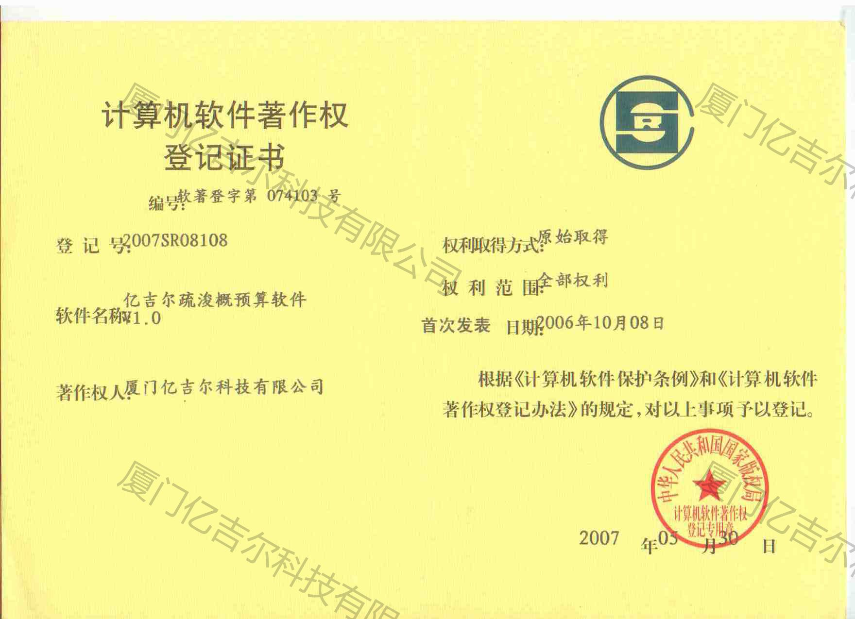 億吉爾疏浚概預(yù)算軟件著作權(quán)登記證書 發(fā)布日期:2007年05月30日 瀏覽次數(shù):3875 關(guān)鍵字: 公司 1/1億吉爾疏浚概預(yù)算軟件著作權(quán)登記證書