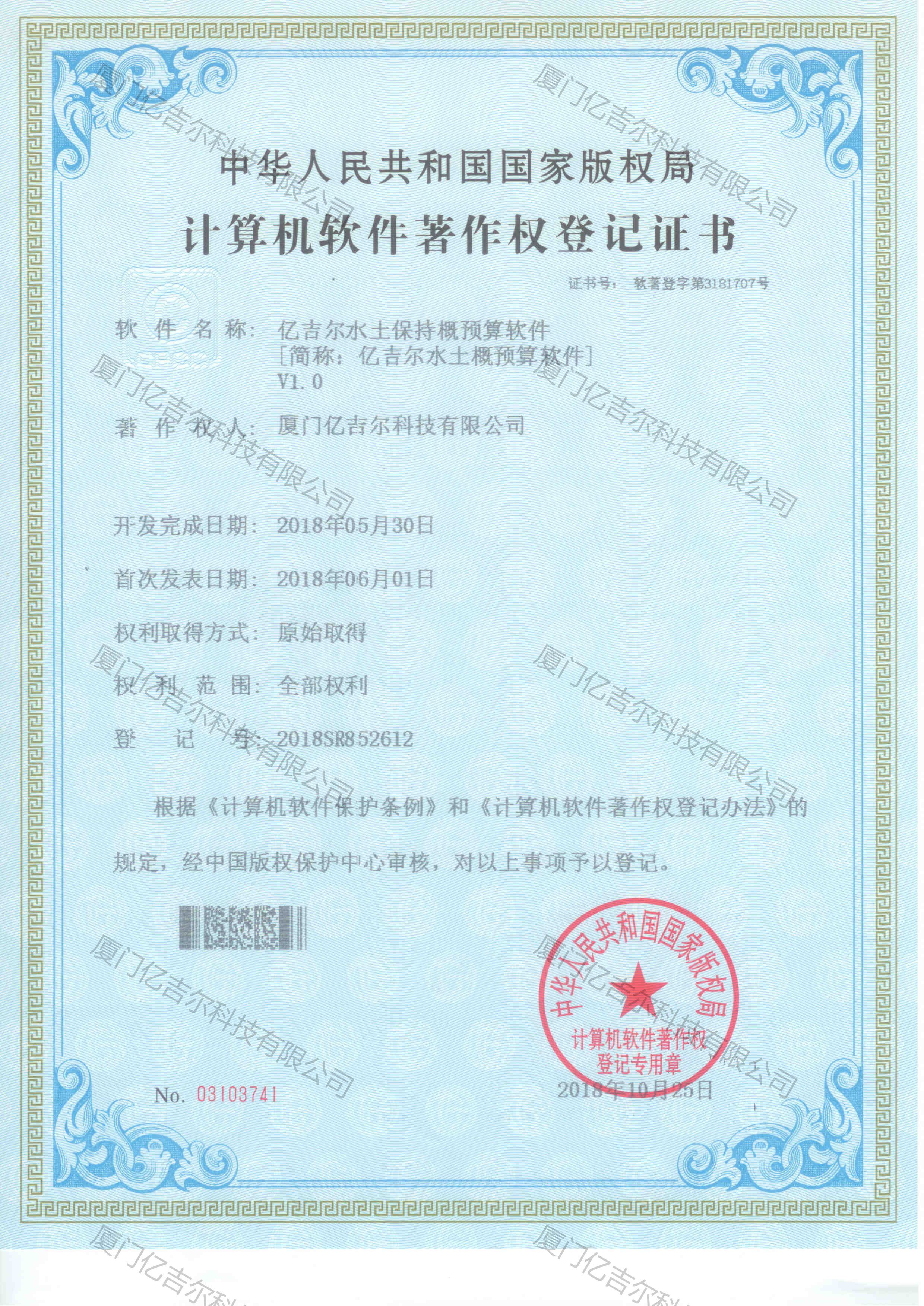 億吉爾水土保持概預(yù)算軟件著作權(quán)登記證書(shū) 發(fā)布日期:2018年10月25日 瀏覽次數(shù):4220 關(guān)鍵字: 公司 1/1億吉爾水土保持概預(yù)算軟件著作權(quán)登記證書(shū)