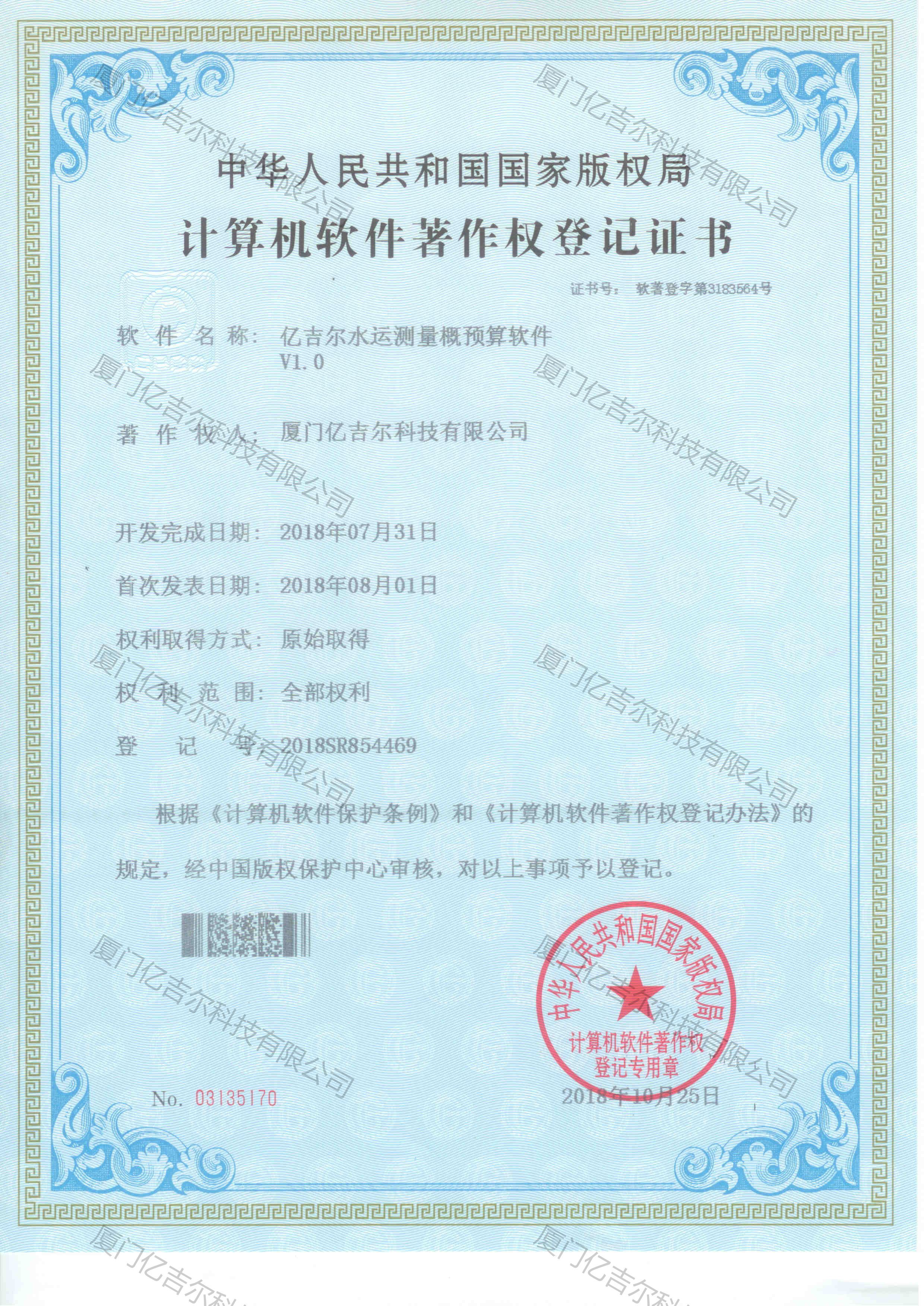 億吉爾水運測量概預(yù)算軟件著作權(quán)登記證書 發(fā)布日期:2018年10月25日 瀏覽次數(shù):4213 關(guān)鍵字: 公司 1/1億吉爾水運測量概預(yù)算軟件著作權(quán)登記證書